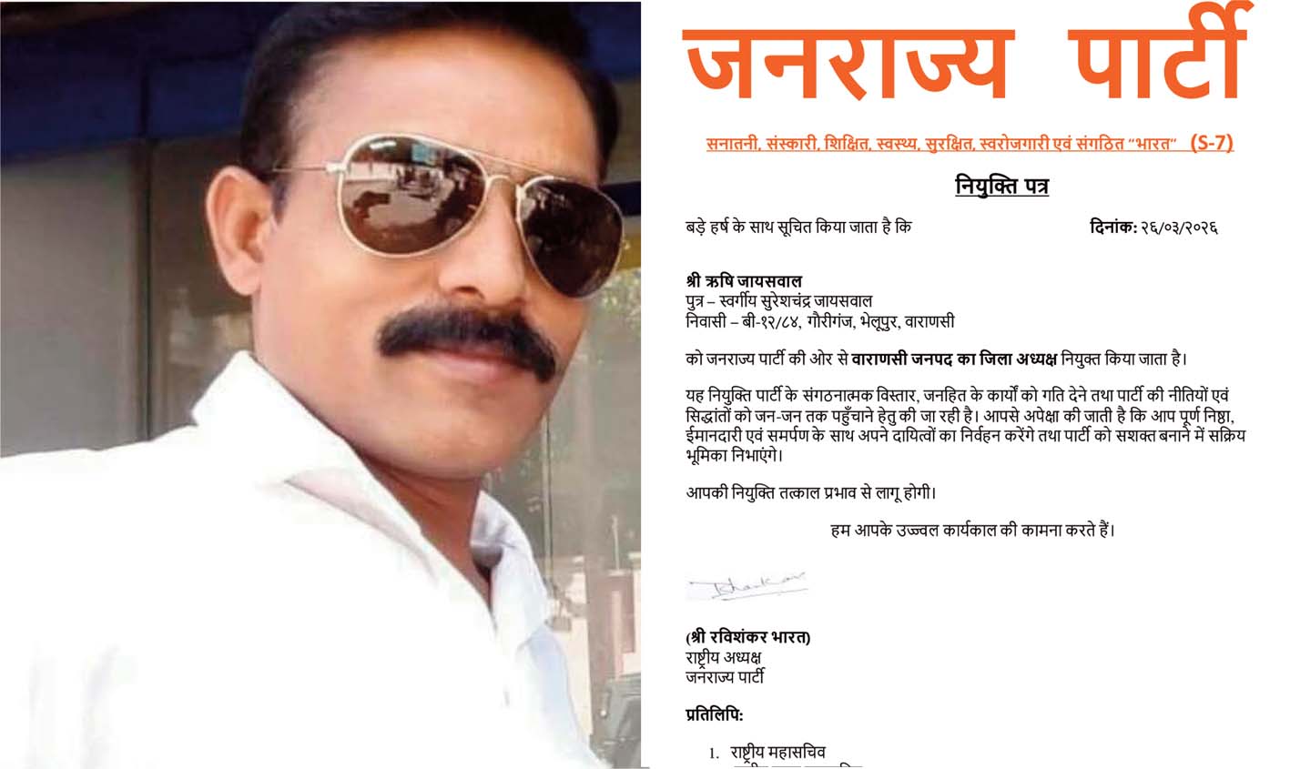 वाराणसी। उत्तर प्रदेश की राजनीति में अपनी सक्रियता बढ़ा रही जनराज्य पार्टी ने धर्मनगरी वाराणसी में अपने संगठन को मजबूती देने के लिए महत्वपूर्ण नियुक्तियां की हैं। पार्टी आलाकमान ने ऋषि जायसवाल और विनय यादव पर भरोसा जताते हुए उन्हें जनपद की अहम जिम्मेदारियां सौंपी हैं।