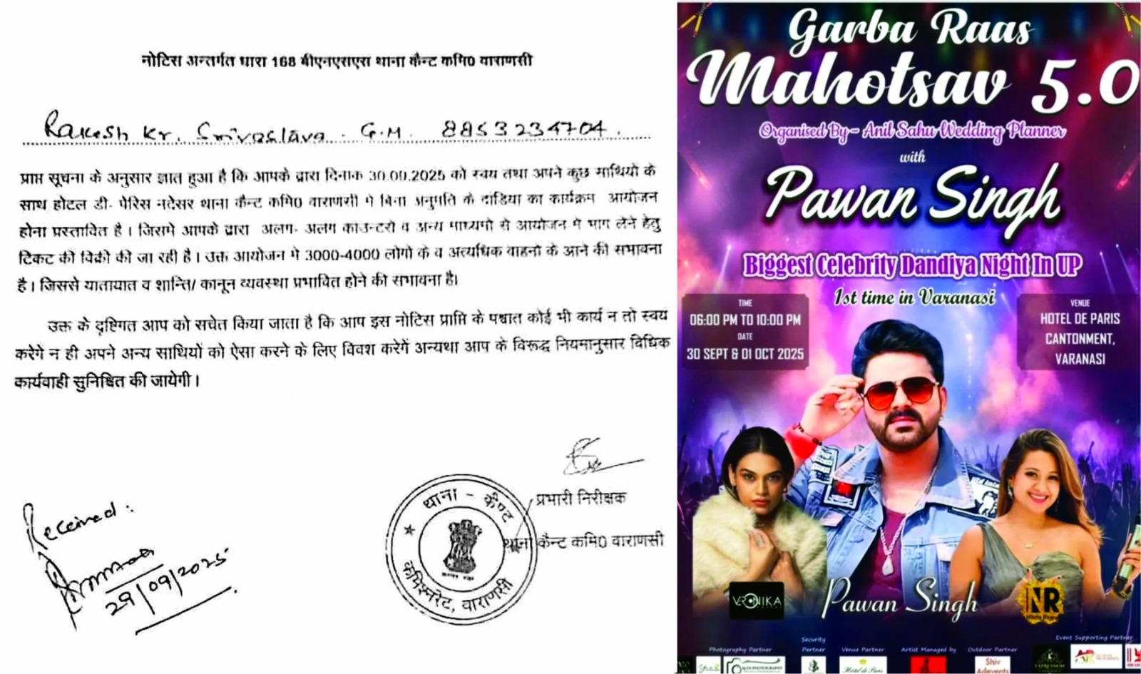 मगर यह कार्यक्रम फीका तब पड़ा जब आगरा के एक सोशल एक्टिविस्ट अमन गुप्ता के द्वारा इस कार्यक्रम के सम्बन्ध में पुलिस आयुक्त वाराणसी मोहित अग्रवाल से शिकायत कर दी गयी। वहीं अमन गुप्ता के द्वारा दिये गये शिकायत में दर्शाया गया है कि वाराणसी के थाना कैंट क्षेत्र में आने वाले होटल डी पेरिस में 30 सितंबर 2025 को भोजपुरी स्टार पवन सिंह के नाम पर डांडिया रास का आयोजन करने के नाम पर 500 में सैकड़ों टिकट बेचे जा चुके हैं। इस आयोजन को इवेंट प्लानर अनिल साहू के द्वारा विभिन्न सोशल मीडिया पर प्रचारित किया जा रहा है। जहां पवन सिंह के नाम पर हजारों की संख्या में लोगों के जुटने की उम्मीद है, ऐसे में जहां एक ओर नवरात्रि और हिंदू संस्कृति की आड़ में व्यापार किया जा रहा है, तो वहीं दूसरी ओर भीड़ जुटने से अफरा तफरी की स्थिति भी हो सकती है।
