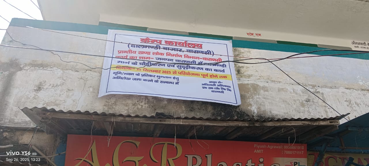 यहां एक बड़ा बैनर लगाया गया है जो स्थिति को साफ करता है। बैनर पर लिखा है: “जनपद वाराणसी में दालमण्डी मार्ग के चौड़ीकरण एवं सुदृढ़ीकरण का कार्य दिनांक 25 सितम्बर 2025 से परियोजना पूर्ण होने तक भूमि/भवन के प्रतिकर भुगतान हेतु अभिलेख जमा करने के सम्बन्ध में।”