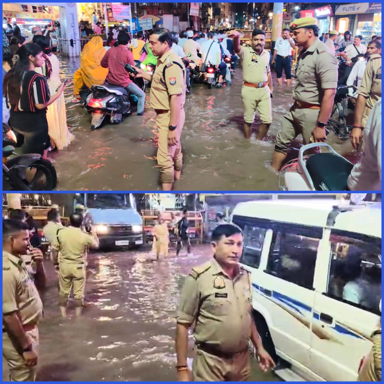 वाराणसी: शनिवार की शाम को हुई मूसलाधार बारिश ने वाराणसी की व्यवस्थाओं की पोल खोल दी। हर तरफ जल-जमाव से जनजीवन अस्त-व्यस्त हो गया, लेकिन इस मुश्किल घड़ी में कुछ अधिकारियों का व्यवहार दिल को छू गया। शहर के सबसे व्यस्त इलाके, गोदौलिया चौराहे पर जब घुटनों तक पानी भर गया, तब आम लोग और यात्री हताश थे, लेकिन तभी पुलिस के आला अधिकारियों ने खुद सड़क पर उतरकर मोर्चा संभाल लिया।